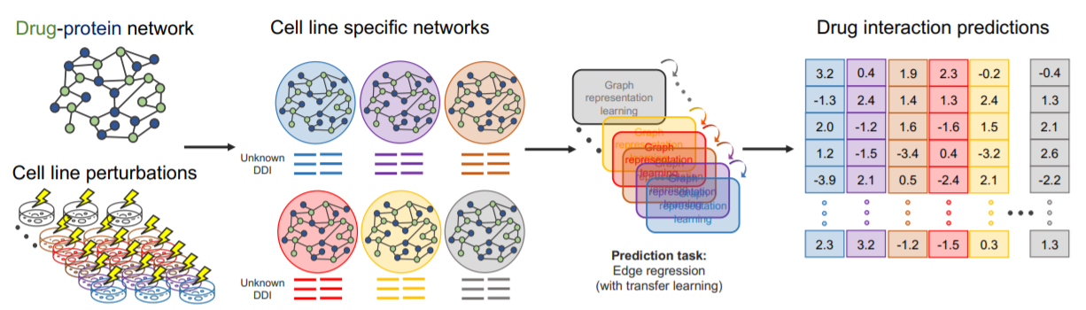 - 治疗层面的应用,多模态基于特异细胞系的药物相互作用预测。给定一个药物蛋白网络和细胞系药物扰动数据,根据从细胞系药物扰动计算出的相互作用分数构建细胞系特异性PPI网络,接下来将这些网络输入到图表征学习模型中进行迁移学习,预测每个细胞系特异网络中的药物-药物相互作用(DDI)。
