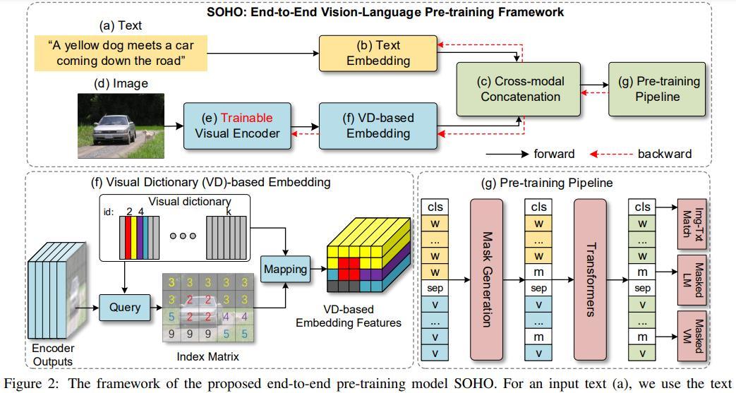 摘要:图像 - 文本检索中通常都是先抽取出图像中的显著区域,再与文字一一对齐。但是,由于基于区域的视觉特征只代表图像的一部分,因此现有视觉语言模型在充分理解配对自然语言的语义方面面临挑战。本文中,北京大学、中山大学、微软亚研等机构的研究者提出了 Seeing Out of tHe bOx(SOHO)的概念,中文翻译即「开箱即看」,它以完整的图像作为输入,并通过端到端的方式学习视觉语言表达。SOHO 最大的亮点是不需要边界框标注,从而使得推理速度比基于区域的方法提升了 10 倍。一系列实验也验证了 SOHO 的有效性。本文已被 CPVR 2021 会议接收。SOHO 模型工作流。
