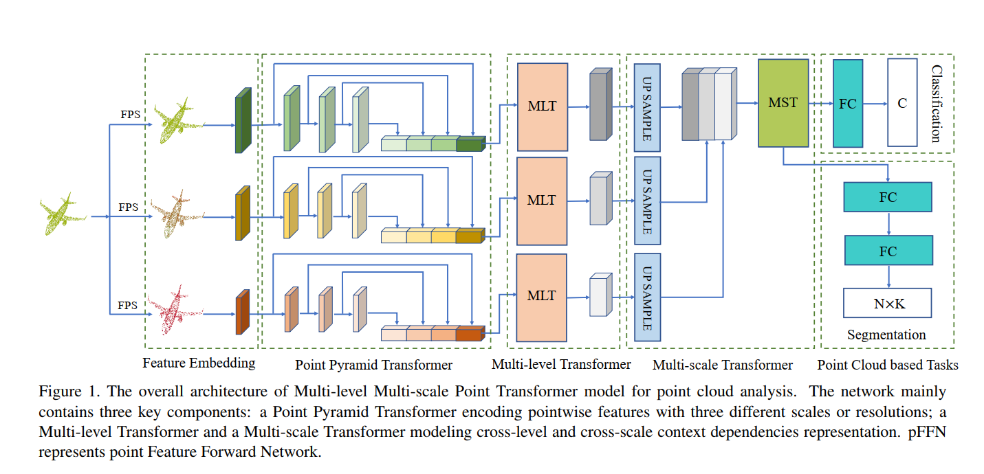 Transformer网络在自然语言处理中的卓越性能促进了这些模型在处理计算机视觉任务(例如图像识别和分割)中的发展。 在本文中,我们介绍了一种新颖的框架,称为多层多尺度点云Tranformer(MLMSPT),该框架可直接在不规则点云上进行表示学习。 具体来说,研究了一个点云金字塔Transformer,以我们定义的不同分辨率或尺度对特征进行建模,然后是一个多层Transformer模块,以汇总来自每个尺度不同级别的上下文信息并增强它们之间的交互作用。 尽管设计了多尺度Transformer模块,以捕获跨不同尺度的表示之间的依赖关系。 对公共基准数据集的广泛评估证明了我们的方法在3D形状分类,part分割和语义分割任务上的有效性和竞争优势。