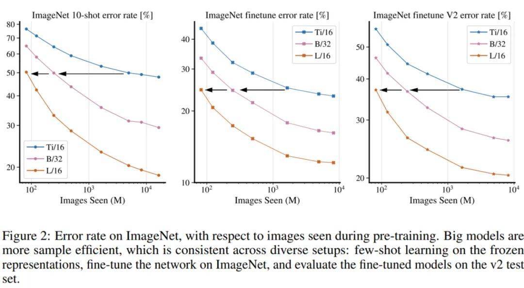 图 2 显示了在预训练期间「可见」的图像总数(批大小乘以 step 数)的表征质量。除了在公共验证集上进行 ImageNet 微调和线性 10-shot 结果外,研究者还报告了在 ImageNet-v2 测试集 [27] 上的 ImageNet 微调模型的结果,作为鲁棒泛化的指标。下图中展示了对 30 亿张图像进行预训练的三个 ViT 模型。