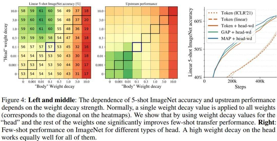 下图 4 展示了这一效果。研究者在 JFT-300M 上训练了一个 ViT-B/32 模型,每个单元格对应不同 head/body 权重衰减值的性能。他们观察到的有趣的一点是:尽管提升了迁移性能,但 head 中高权重衰减却降低了预训练(上游)任务的性能。
