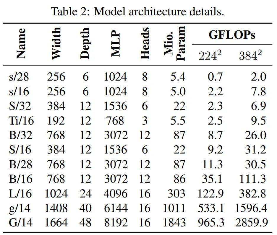 在本文中,研究者选择了 ViT 模型,模型参数从 500 万到 2 亿,训练数据量从 3000 万到 30 亿。下表 2 为具体的模型架构细节: