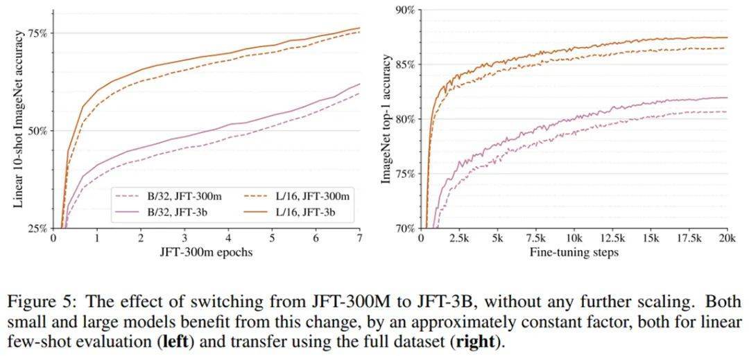 下图 5 展示了数据集从 JFT-300M 到 JFT-3B 过程中对模型性能的影响。可以观察到,更大规模的 JFT-3B 数据集可以得到更好的模型,所以 JFT-300M 数据集的过拟合并不是实现性能提升的唯一原因。
