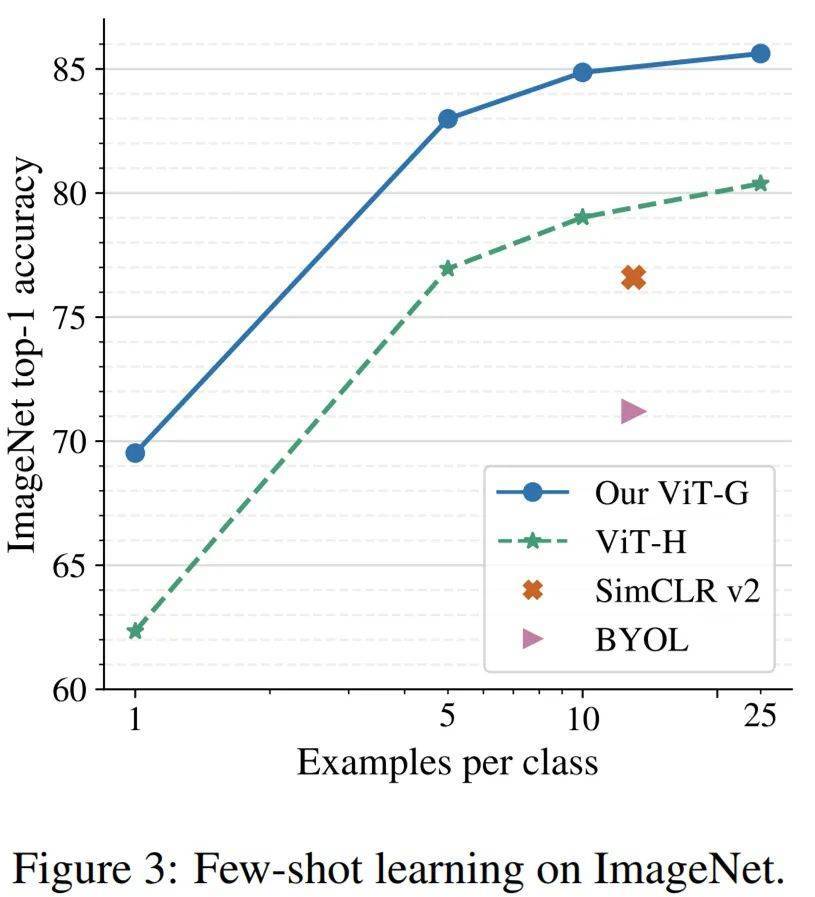 图 3 显示了在 ImageNet 上进行小样本学习(few-shot learning)结果。由结果可得,ViT-G/14 比以前最好的 ViT-H/14 模型 [11] 表现优异(超过 5%),达到 84.86% 的准确率,每类 10 个例子。