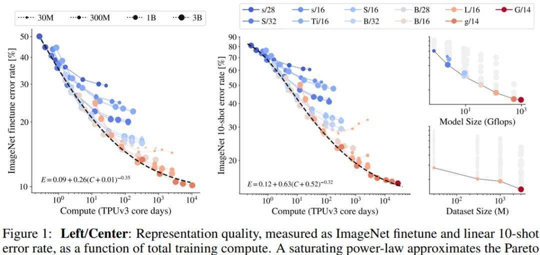 在今天介绍的这篇论文中,原 ViT 团队成员、谷歌大脑的几位研究者集中研究了预训练 ViT 模型用于图像分类任务的迁移性能的扩展规则(scaling law)。特别是,研究者试验了从 500 万到 20 亿个参数不等的模型、从 3000 万到 30 亿个训练图像不等的数据集以及从低于 1 个 TPUv3 核每天(core-day)到超过 10000 个核每天的计算预算。其主要贡献是描述 ViT 模型的性能计算边界。
