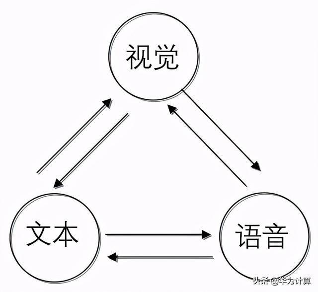 自动化所首次提出了视觉-文本-语音三模态预训练模型,实现了三模态间相互转换和生成。其核心原理是视觉、文本、语音不同模态通过各自编码器映射到统一语义空间,然后通过多头自注意力机制(Multi-head Self-attention)学习模态之间的语义关联以及特征对齐,形成多模态统一知识表示,再利用编码后的多模态特征,然后通过多头自注意力机制进行通过解码器分别生成文本、图像和语音。这里三模态互相转化和相互生成示意如图1所示: