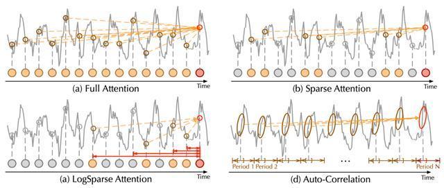 相比于之前的点向连接的注意力机制或者其稀疏变体,自注意力(Auto-Correlation)机制实现了序列级的高效连接,从而可以更好的进行信息聚合,打破了信息利用瓶颈。