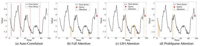 通过上图可以验证,Autoformer中自相关机制可以正确发掘出每个周期中的下降过程,并且没有误识别和漏识别,而其他注意力机制存在缺漏甚至错误的情况。