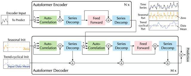 作者受到时序分析经典方法和随机过程经典理论的启发,重新设计模型,打破Transformer原有架构,得到Autoformer模型: