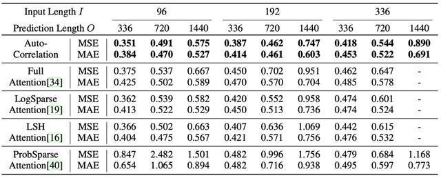 自相关机制 vs. 自注意力机制:同样基于深度分解架构,在众多输入-输出设置下,自相关机制一致优于自注意力机制及其变体,比如经典Transformer中的Full Attention,Informer中的PropSparse Attention等。