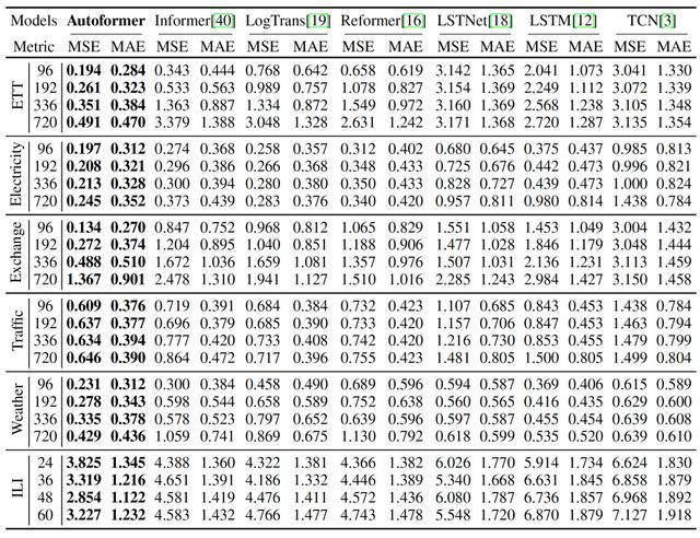 Autoformer在多个领域的数据集、各种输入-输出长度的设置下,取得了一致的最优(SOTA)结果。