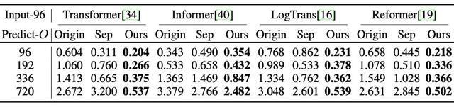 ETT数据集上的MSE指标对比,Origin表示直接预测,Sep表示先分解后预测,Ours表示深度分解架构。