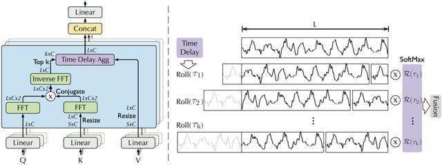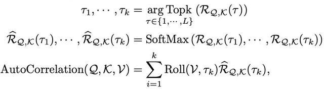为了实现序列级连接,还需要将相似的子序列信息进行聚合。自相关机制依据估计出的周期长度,首先使用操作进行信息对齐,再进行信息聚合: