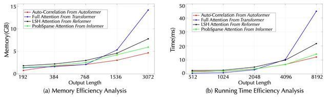 在显存占用和运行时间两个指标上,自相关机制均表现出了优秀的空间、时间效率,两个层面均超过自注意力机制及其稀疏变体,表现出高效的复杂度。