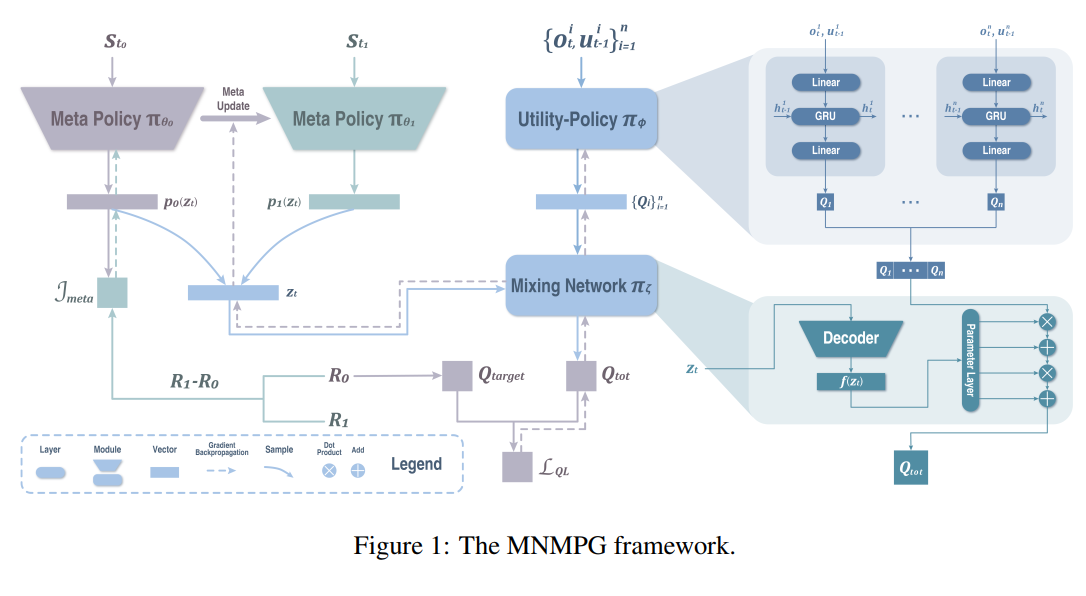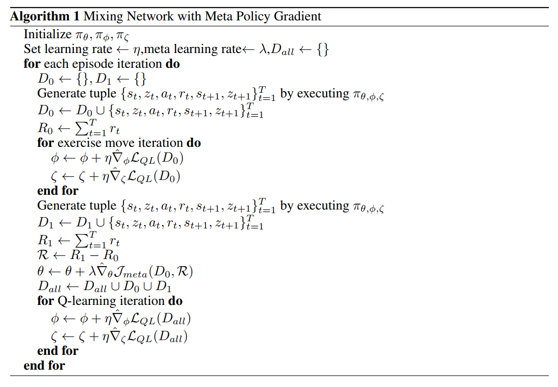 【推荐理由】非中心式执行(CTDE)&中心式训练是MARL环境中的一种,而回报分解是其中的一个关键问题。这种环境中的全局信息包含了所有智能体的状态与相关环境,以将Q值分解为单独的信用值。本文提出了一种可高度利用上述全局信息的基于元学习的、与元策略梯度相结合的混合网络,以获得具有更加精细的回报分解能力的全局架构。训练过程中,智能体会在全局架构下通过几个Q值更新来进行“练习行进”,“练习行进”之前和之后的回报差异对于全局架构的最终训练具有指导作用,可使得智能体的探索行为更好。并且,元学习方法使得本文算法可完全基于自我改进,不需要任何全局先验知识。