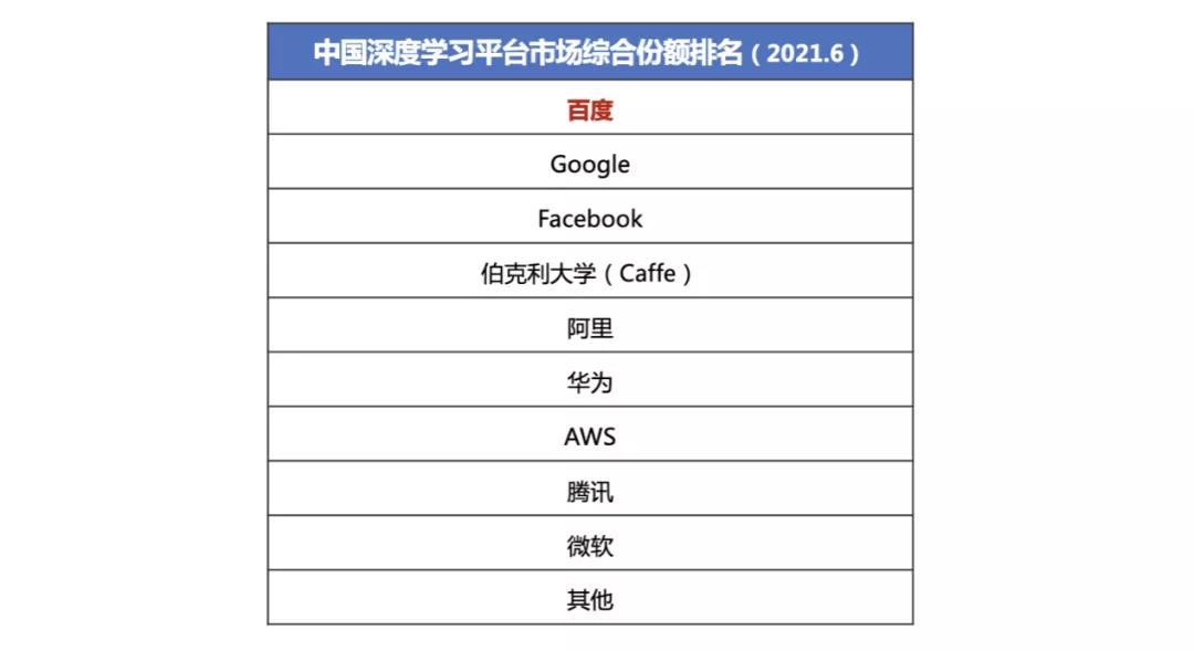 近日,权威数据调研机构 IDC 发布 2021 年上半年深度学习框架平台市场份额报告。调研显示,百度在中国深度学习平台市场中的综合份额持续增长,跃居第一。