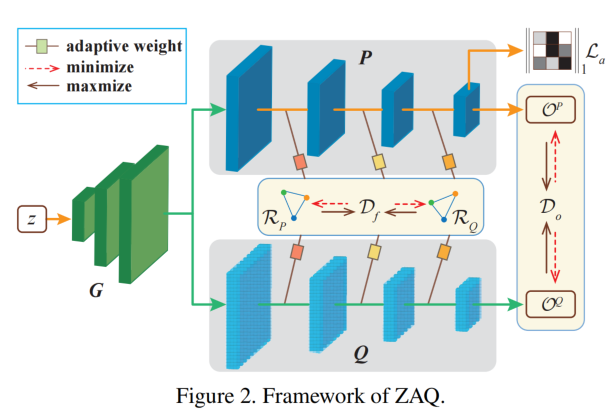 为了在无法获得原始数据情况下实现模型量化,现有方法采用后训练量化或BN层统计量引导生成的合成样本对网络进行微调,但两者存在性能低下的问题,本文提出了一个零样本对抗量化(ZAQ)框架,以对抗学习的方式优化量化模型,引入新的特征图信息监督提高生成样本质量,促进了从全精度模型到其量化模型的知识迁移,算法性能SOTA。