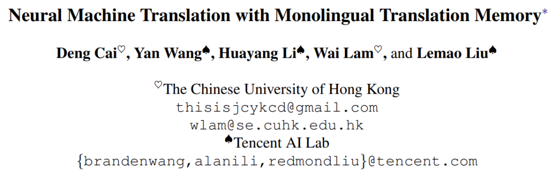 在不久之前公布的获奖论文中,腾讯 AI Lab 与香港中文大学合作完成的《Neural Machine Translation with Monolingual Translation Memory》获得杰出论文。本文作者也受邀参与机器之心举办的 ACL 2021 论文分享会,感兴趣的同学可以点击阅读原文查看回顾视频。