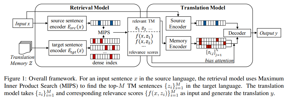 该研究首先将翻译任务转化为两步过程:检索和生成,并在论文中描述了跨语言记忆检索模型和记忆增强型(memory-augmented)翻译模型的模型设计。最后,该论文展示了如何使用标准最大似然训练联合优化这两个组件,并通过交叉对齐预训练解决了冷启动(cold-start)问题。