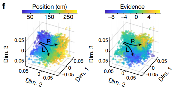 如图3所示,研究者在VR平台搭建了T型跑道,并在跑道两侧设置柱状线索。他们训练鼠通过T字型跑道,并在线索多的转弯侧给予奖励。等鼠学会了这个任务后,就开始用双光子记录鼠在通过跑道时的海马区活动。在这个实验中,左右侧线索数量的差异即为抽象认知变量,而鼠在跑道中的位置即为空间位置变量。
