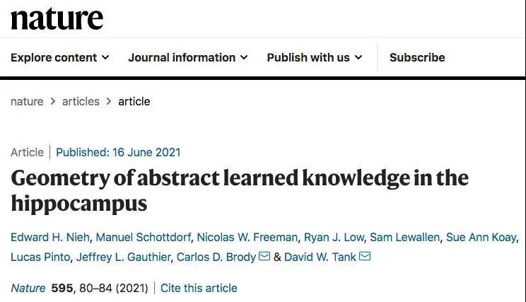1. Nieh, E. H., Schottdorf, M., Freeman, N. W., Low, R. J., Lewallen, S., Koay, S. A., Pinto, L., Gauthier, J. L., Brody, C. D., & Tank, D. W. (2021). Geometry of abstract learned knowledge in the hippocampus. _Nature_, _595_(7865), 80–84. https://doi.org/10.1038/s41586-021-03652-7