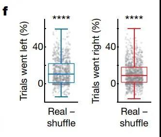 研究者找到了一些神经元对,这些神经元对在多个试次中都存在序列性兴奋活动,即在一个神经元兴奋后,另一个也随即兴奋。他们通过对比每个神经元对在左右转和随机试次中出现的概率,将神经元对分为左转对和右转对。并分别用其在神经活动空间的轨迹对转向行为进行预测。结果发现,有转向偏好的神经元对相比从随机试次中生成的神经元对,可以更好地预测转向行为。说明这种序列活动信息在神经活动空间与个体的决策行为具有耦合性。