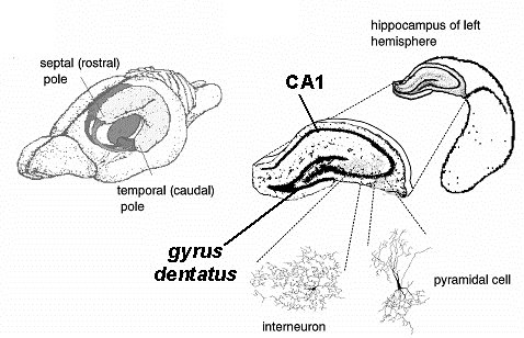 上:大鼠脑中海马体与海马体1区(CA1)示意图。