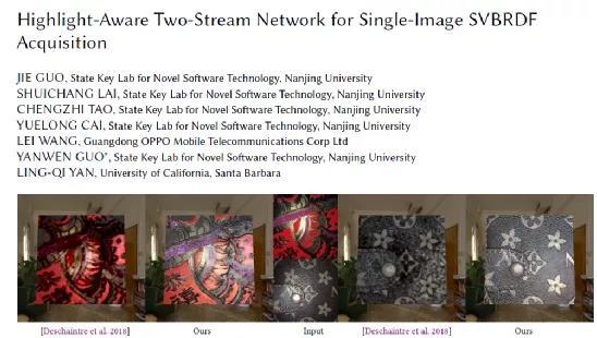 在OPPO 和南京大学合作的题为“Highlight-Aware Two-Stream Network for Single-Image SVBRDF Acquisition”的论文中,研究员们从深度学习出发,用神经网络结合大量数据,尝试在未知的空间变化情况下,完成平面材质的外观建模。论文中的方法仅采用了单张图片作为输入,不需要相机参数和光源参数,就能输出高质量材质参数。文本已被计算机图形学顶级国际学术会议 ACM SIGGRAPH 2021 接收。SIGGRAPH是全球影响最广、规模最大、最权威的计算机图形学会议,每年全球仅130篇左右论文入选。