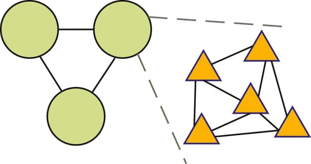 图3. 大脑中的计算分布在网络中通信的特定组件之间。绿色圆圈表示皮质区域网络,每个区域执行不同的功能。橙色三角形表示锥体细胞网络,它们通过协作计算单个皮质区域的功能。Levy 和 Calvert 认为基本单元的计算成本相比于它们之间的通信成本而言微不足道。