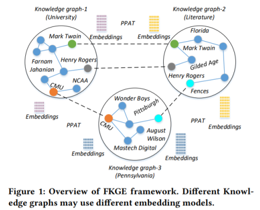知识图谱嵌入在知识表示、推理和数据挖掘等应用中起着十分重要的作用。然而,对于多个跨领域的知识图谱来说,目前最先进的嵌入模型无法在保护数据交换过程中产生的隐私的同时,充分利用来自不同知识领域的数据和信息。并且集中式的嵌入模型无法拓展到广泛的现实世界的知识图谱中。因此,我们提出了一种新颖的去中心化的可拓展学习框架——Federated Knowledge Graphs Embedding(FKGE),实现了在保护隐私的同时以异步和对等的方式学习不同知识图谱的嵌入。FKGE 利用成对的知识图谱间的对抗生成将不同领域的相同实体和关系转换到临近嵌入空间。为了保护训练数据的隐私,FKGE进一步实现了隐私保护对抗模型(PPAT),来保证原始数据不被泄露。最后,进行了大量的实验来评估11个知识图谱上的FKGE模型,三重分类和链路预测任务的性能提高了近17.85%和7.9%,这证明了FKGE模型的质量取得了显著且一致的改进。