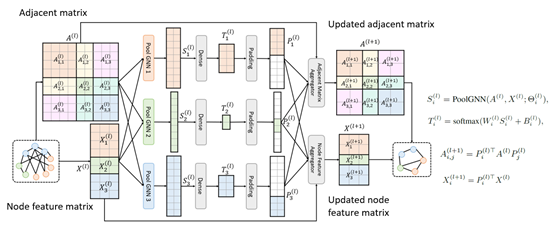 HG-Pool 方法的框架如图9所示。对于每种节点,首先使用一个不同的池化 GNN 模型来学习类型特定的节点表示。然后使用带 softmax 激活函数的线性变换,将这些节点表示转换为类型特定的池化矩阵。最后使用 padding 后的池化矩阵,将当前邻接矩阵和节点特征矩阵转换为更小的矩阵。