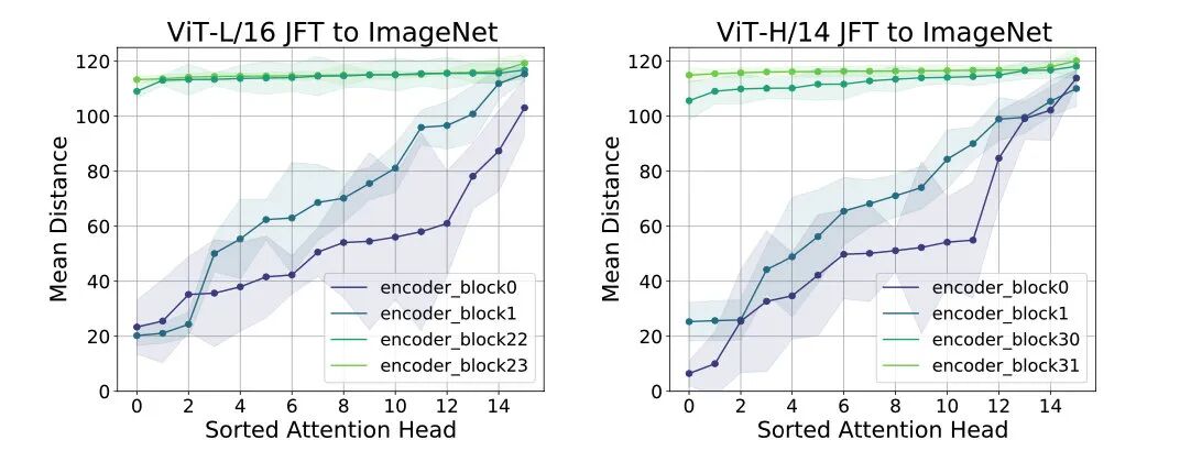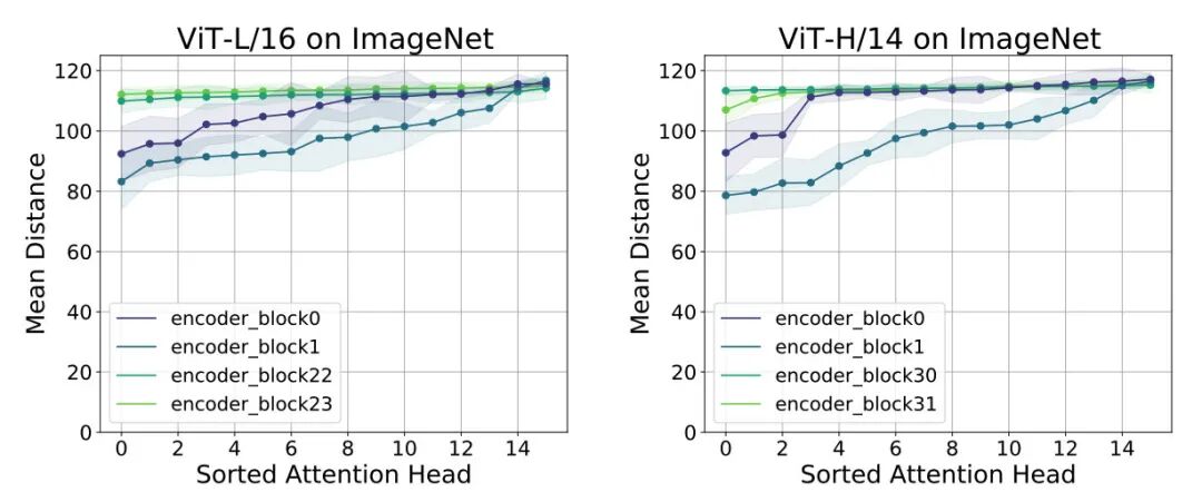 对 ViT 每层各个头进行分析,每层各个头算 attention 的平均距离,排序画图,如下