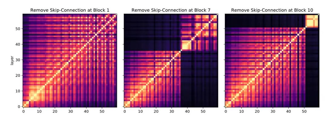 能明显看到去掉残差连接后,不同层表示之间相似度的变化。