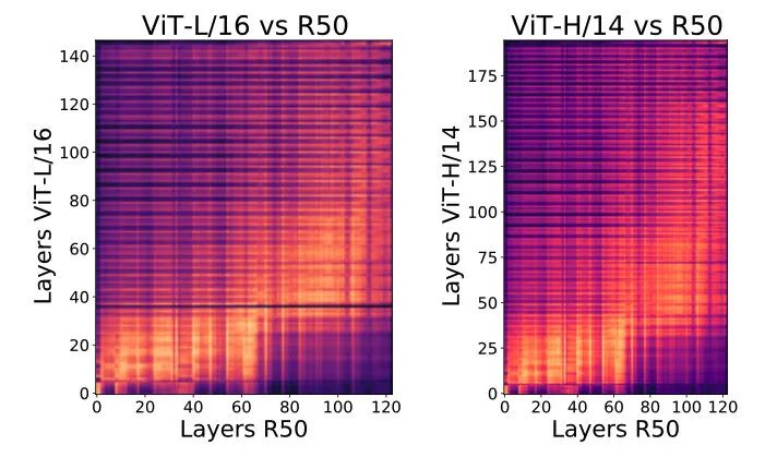 对不同模型表征之间进行相似度计算,看看 ViT 和 ResNet 学到的表征是不是有相似的。