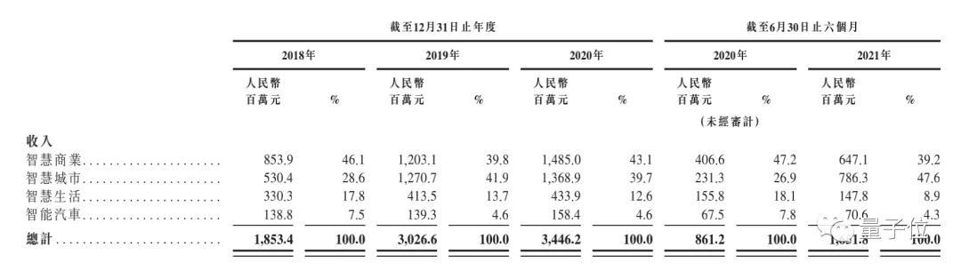 智慧城市业务于2018年、2019年及2020年以及2021年上半年分别产生28.6%、41.9%、39.7%及47.6%的收入。