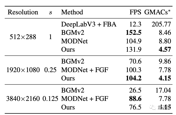 从下面这张表格中可以看出,在1080p视频上RVM的处理速度是最快的,在512×288上比BGMv2略慢,在4K视频上则比带FGF的MODNet慢一点。研究人员分析,这是因为RVM除了alpha通道外还预判了前景。