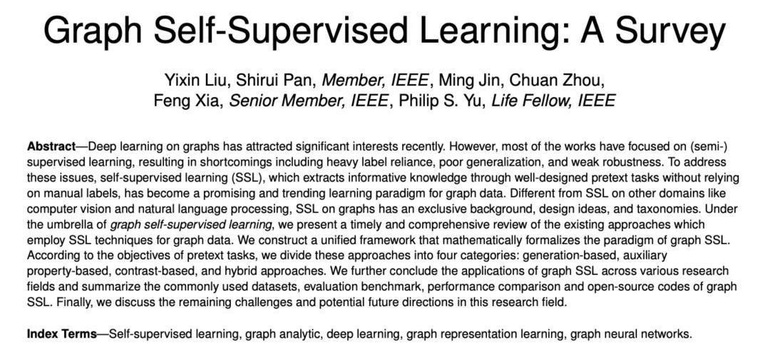 本文是来自澳大利亚蒙纳士大学(Monash University)图机器学习团队联合中科院、联邦大学,以及数据科学权威 Philip S. Yu 对图自监督学习领域的最新综述,从研究背景、学习框架、方法分类、研究资源、实际应用、未来的研究方向的方面,为图自监督学习领域描绘出一幅宏伟而全面的蓝图。