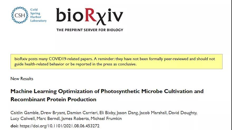 同日,两家公司合作的论文以《Machine Learning Optimization of Photosynthetic Microbe Cultivation and Recombinant Protein Production》 发表在生物学预印本网站 bioRxiv 上,详细介绍了使用机器学习通过贝叶斯黑盒优化来提高螺旋藻的生产力。研究表明,在机器学习的参与下,螺旋藻生产蛋白质的能力加倍。