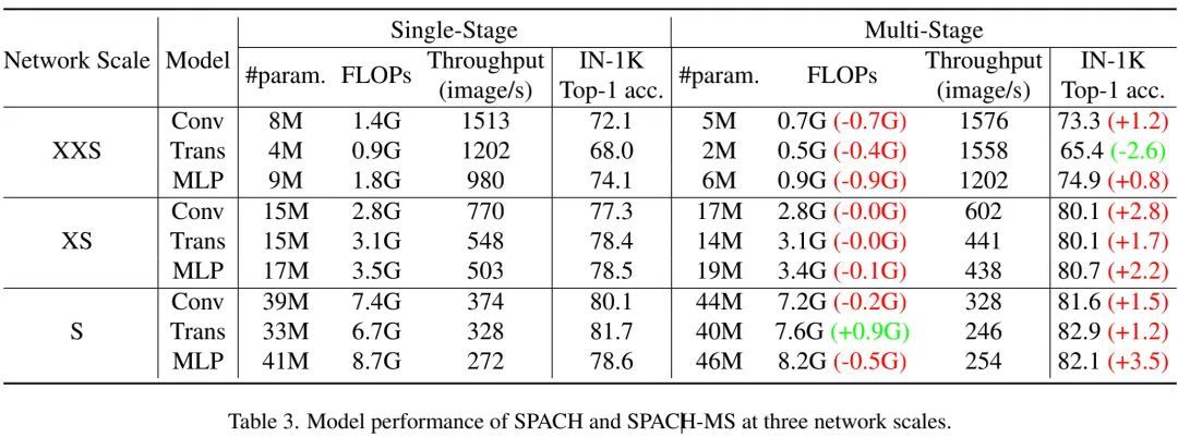 下表比较了单阶段与多阶段SPACH模型在ImageNet分类任务上的性能对比,从中可以看到:对于三种大小网络、三种类型网络架构,多阶段网络均取得了比单阶段网络更佳的复杂度-精度均衡 。