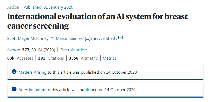 去年1月,谷歌的健康团队又联合 DeepMind 在 Nature 上发表了一项将 AI 用于检测乳腺癌的研究成果。他们开发了一个针对乳腺癌的 AI 筛查系统,可以对乳腺癌 X 射线造影数据进行大规模分析与处理,也引起了广泛关注。