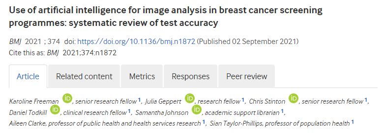 近日,《英国医学杂志》(The BMJ)刊登了一篇来自英国华威大学医疗科学部门研究人员(以下简称“该团队”)的研究工作。该团队对近年 AI 技术用于乳腺癌筛查的工作进行了检索,希望检验 AI 技术用于乳房 X 光摄像识别的准确度。