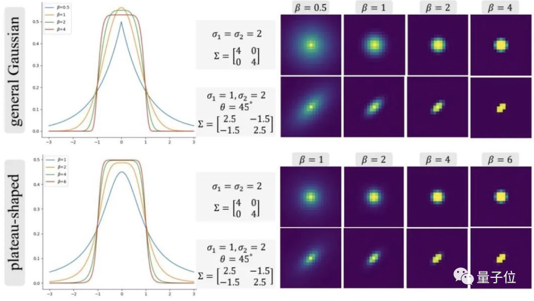 在模糊(blur)退化方面,为了包含更多不同的核形状,Real-ESRGAN采用了广义高斯模糊核和plateau-shaped分布。