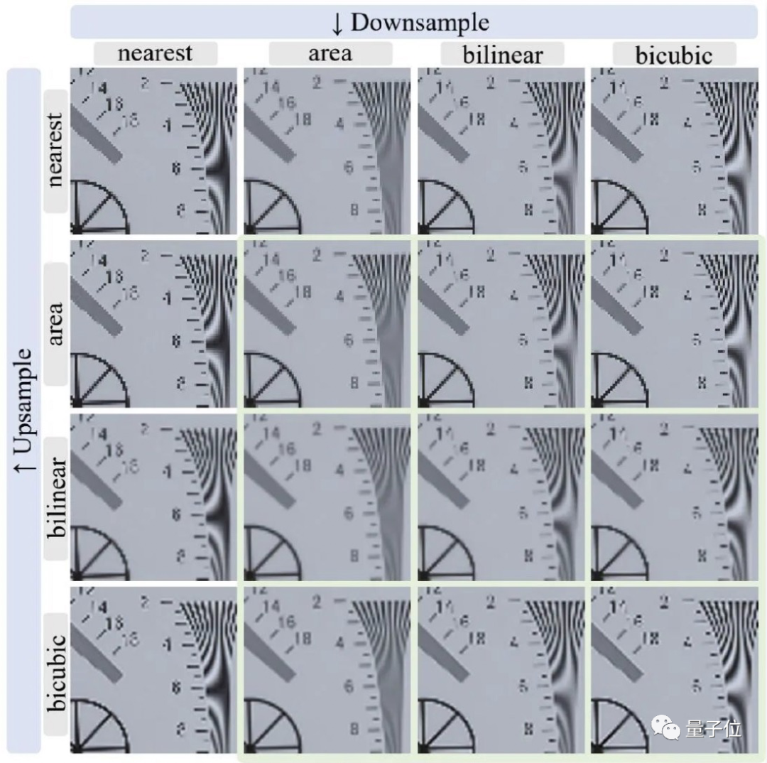 resize也就是经典退化模拟里的下采样,在这里为了产生更多模糊图像,就改成了上采样+下采样的组合操作。resize方法中,由于最近邻插值会导致错位,最后就只考虑了面积、双线性和双三次插值。