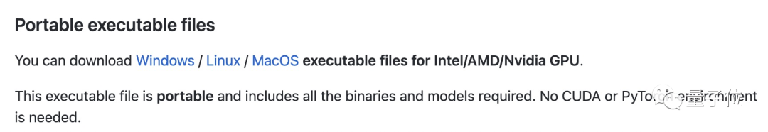 如果你也想试试,可在GitHub上下载该模型的可执行文件,Windows/Linux/MacOS都可以,且不需要CUDA或PyTorch的支持。