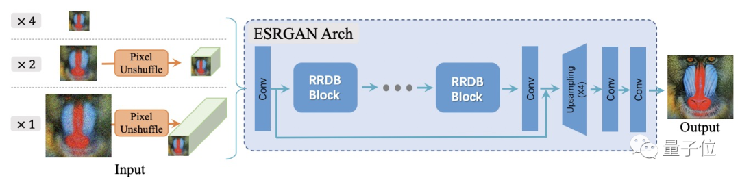Real-ESRGAN的生成器沿用了ESRGAN的RRDBNet,还扩展了原始的×4 ESRGAN架构,以执行resize比例因子为×2和×1的超分辨率放大。