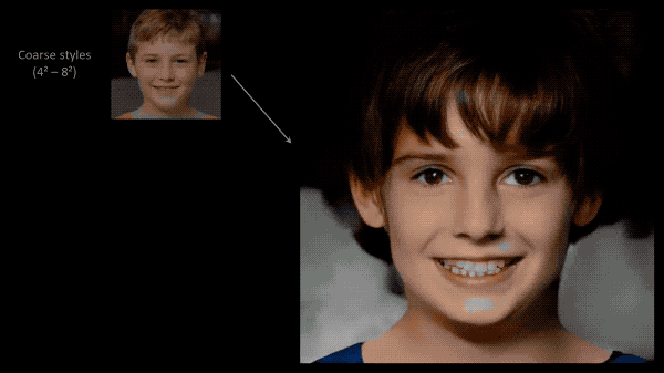 4x4到32x32分辨率层的特征能改变姿势、发型、脸型、五官等能识别一个人身份的粗粒度特征。