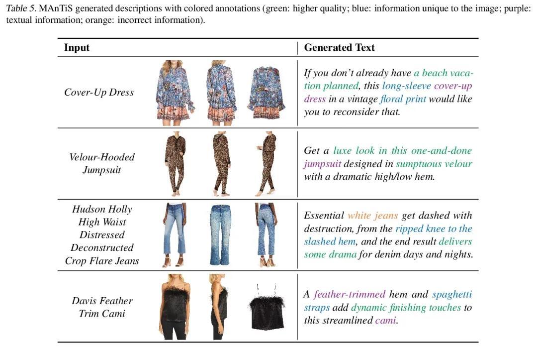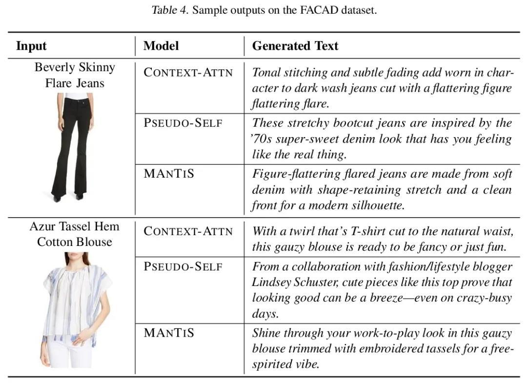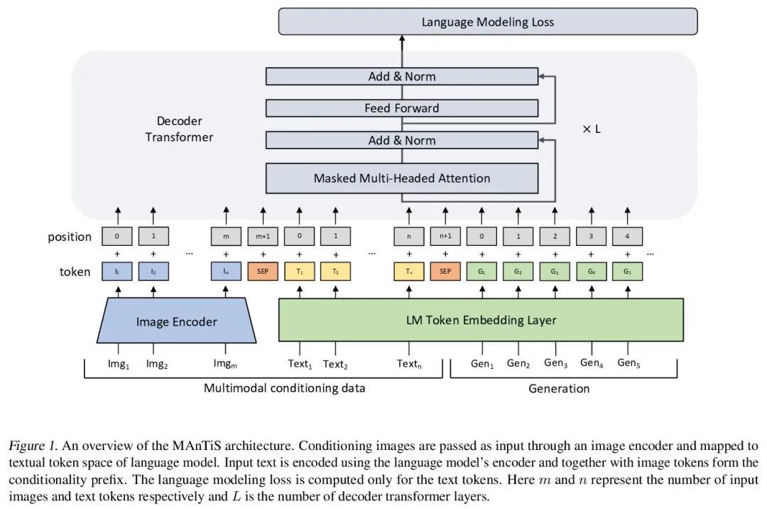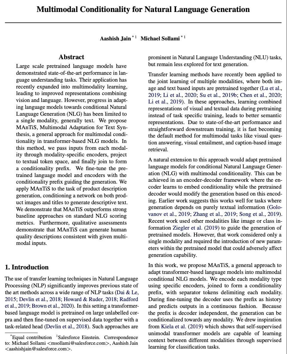 自然语言生成的多模态条件性。大规模预训练语言模型在语言理解任务上表现出最先进的性能。它们的应用最近已经扩展到多模态学习中,导致了结合视觉和语言的改进表示。然而,在微调语言模型以实现有条件的自然语言生成(NLG)方面的进展仅限于单一模式,通常是文本。本文提出MAnTiS(Multimodal Adaptation for Text Synthesis),一种在基于transformer的NLG模型中实现多模态条件的一般方法,将每种模态的输入通过特定模态编码器,投射到文本token空间,最后连接起来形成一个条件性前缀。对预训练语言模型和编码器进行微调,用条件性前缀来指导生成。将MAnTiS应用于产品描述生成任务中,在产品图片和标题上微调一个网络以生成描述性文本。证明了MAnTiS在标准NLG评分指标上优于强大的基线方法。此外,定性评估表明,MAnTiS能生成与给定的多模态输入一致的人工质量描述。