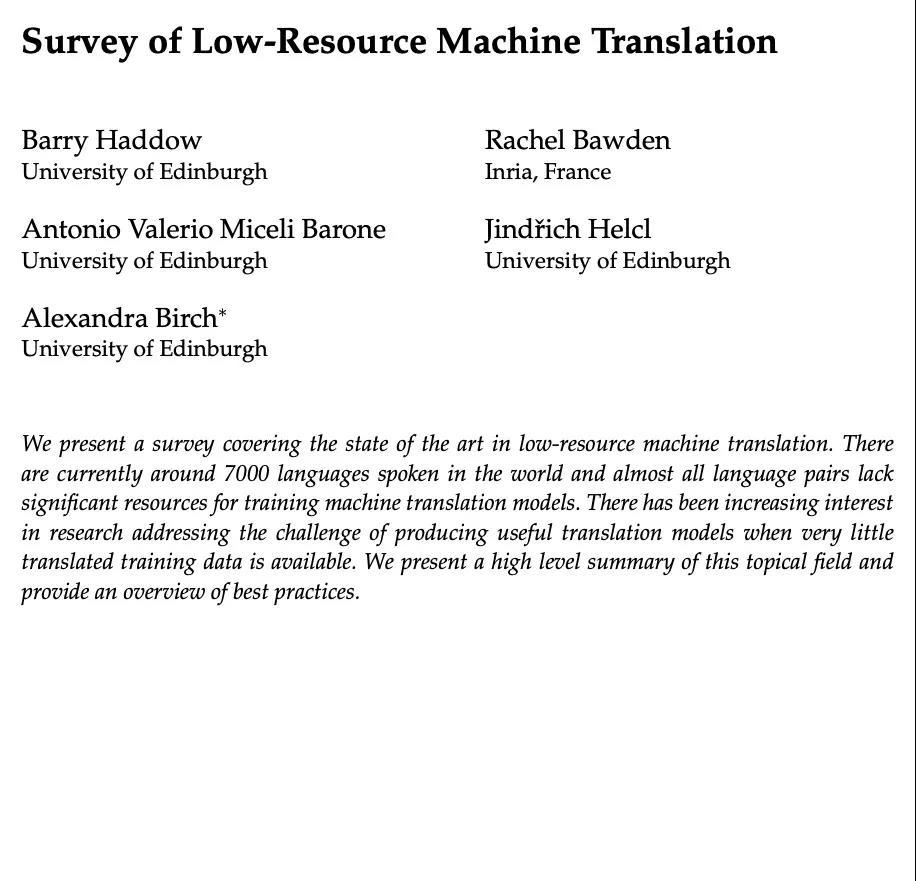 [CL] Survey of Low-Resource Machine Translation