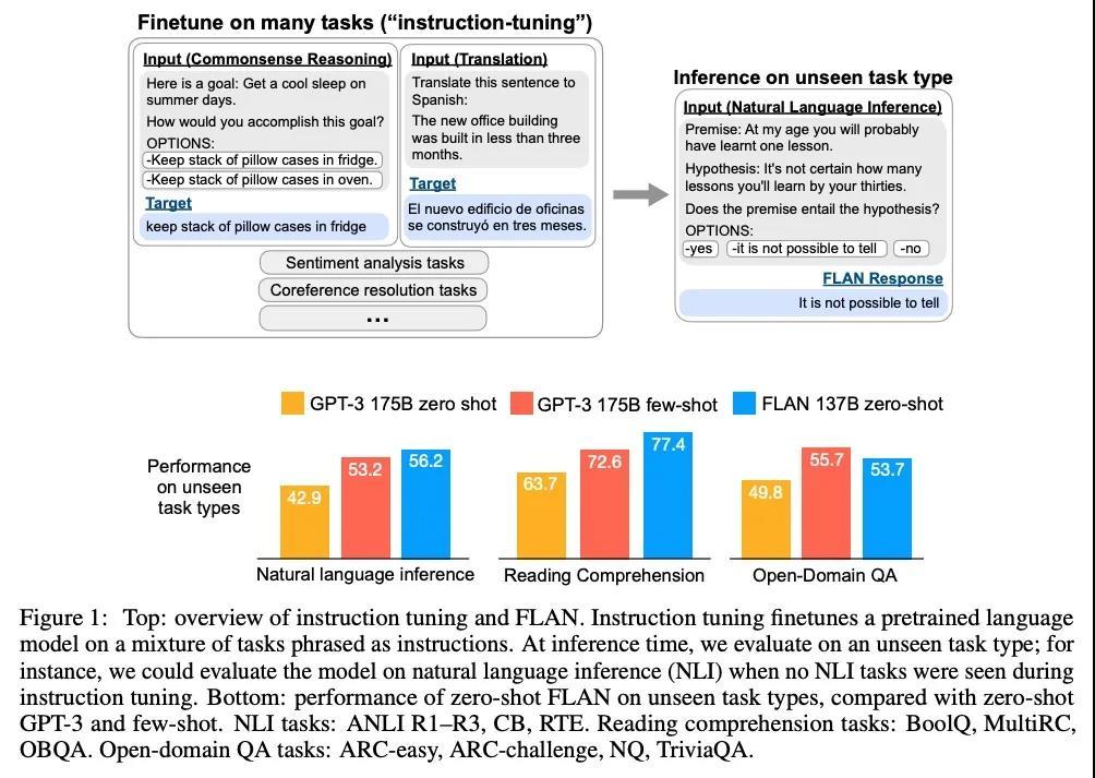 用指令微调提高语言模型零样本学习能力。本文探讨了一种提高语言模型零样本学习能力的简单方法。指令微调——在通过指令描述的任务集合上对语言模型进行微调——可以大幅提高在未见任务上的零样本性能。采用一个137B参数的预训练语言模型,在60多个通过自然语言指令模板口述的NLP任务上对其进行指令微调。在未见过的任务类型上评估该指令微调的模型,称之为FLAN。FLAN极大提高了其未修改的对应模型的性能,在所评估的25个任务中的19个任务上超过了零样本的175B GPT-3。在ANLI、RTE、BoolQ、AI2-ARC、OpenbookQA和StoryCloze上,FLAN甚至以很大的优势超过了少样本的GPT-3。消融研究显示,任务数量和模型规模是指令微调成功的关键因素。