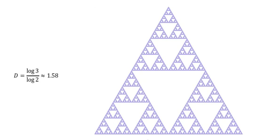 我们来看一些具体的例子,比如分形,在计算分形维度的时候,我们进行的便是重整化而不是粗粒化。具体操作分为两步,第一步,将原本的三角形边长放大两倍,第二步则是计算扩大的几何体与原有几何体的相似部分如何对应,即扩大后的面积变为原来的3倍,边长变为2倍。于是,对边长和面积同时取对数,其比值就是分形维度,这个过程就是重整化。